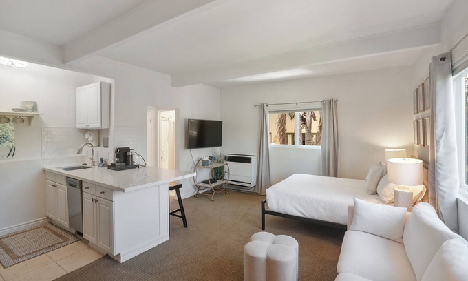 Welcome to our Historic West Beach Studio for those who desire a beautiful location, combined with unparalleled quality and price. Located in the picturesque West Beach Area, where the streets meet the ocean, the Getaway is steps from the beach, and mere blocks from Stearns Wharf, the vibrant Funk Zone as well as world renowned dining and downtown shops.