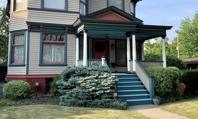 Thank you for considering a stay at our home in Bay City, Michigan! This is a 3 story Victorian home that your group will have to yourselves. The entrances feature digital key pads. You will be given the code approximately an hour before check in time. The code will be the same for both doors. The first floor features a well-equipped kitchen with granite counter tops and stainless steel appliances (dishwasher, gas stove/oven, refrigerator with ice/water in-door). Off the kitchen is a butler's pantry that provides oodles of storage and leads to a half bath. The dining room is attached to the other side of the kitchen, with a large 9' dining room table for family meals and one high chair. Additional seating for 3 people is at the kitchen island. Through the dining room is the living room with a electric fireplace and baby grand piano. The living room has a large sectional, 2 reclining chairs and a Roku tv so you can stream using your personal log-ins/accounts. The billiards room offers a full size oak slate table and plenty of pool cues to chose from. Through the billiards room is the library which has a work station with high speed internet, many boxed games, futon, treadmill, hand weights, yoga mat, and pack and play for baby. The library does not have a door.