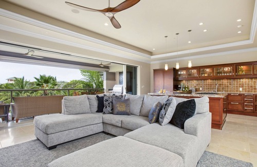 Elegantly appointed, this villa features an indoor-outdoor lifestyle with retractable sliding glass lanai doors that open to the kitchen and great room, allowing refreshing Maui-breezes to permeate throughout. You’ll spend your evenings watching the sunset from your upstairs lanai while cooking up the day’s catch on your Wolf gas grill and listening to the sounds of the waterfall below.