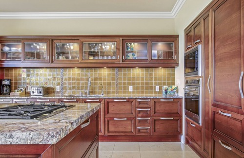 The gourmet chef’s kitchen has granite countertops, sub-zero refrigerator, and a Wolf five-burner gas cooktop. The kitchen island offers a dining area for six, while the lanai has an outdoor dining table with seating for six. The living room offers plenty of comfortable seating, a 55†Samsung Smart TV, and a desk if you have to sneak in a bit of work.