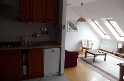 2-room penthouse 60 m2 on 2nd floor. Beautiful and cosy furnishings: open living/dining room 23 m2, with sloping ceilings with 1 double sofabed (130 cm, length 195 cm), 1 folding bed (80 cm, length 195 cm), dining table, satellite TV, video and radio. 1 room 16 m2, with sloping ceilings with rooflight with 2 beds (80 cm, length 200 cm), air conditioning. Open kitchen (dishwasher, 4 gas rings, kettle, microwave, freezer, electric coffee machine). Bath/WC. Electric heating. Balcony 4 m2, south-east facing position. Terrace furniture. View of the garden. Facilities: washing machine, iron, baby cot for up to 2 year olds. Internet (WiFi, free). Suitable for families.