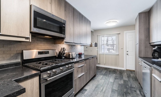1400 SF renovated unit is 7-9 min away from interstate 90, which takes you straight to O’hare Air & downtown! This property has 3 bedrooms, & 2 full bathrooms. Master suite has a KING, and 2 bedrooms have a Queen. The living room has room for 1 air mattress (Total of 4 beds). Plenty of Kitchen utensils, all you need in a kitchen, including cooking spices and oils! Children friendly & lots of technology!