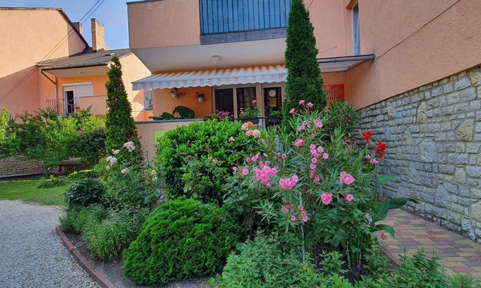 The holiday apartment is located in an apartment house built in 1995, was renovated in 2020 and is furnished in a modern style. The property is located in a holiday home area, in the town centre. Also due to its sunny location the domicile is popular. Available for your exclusive use: sunbathing lawn, parasol, sun lounger and garden furniture.LocationBalatonföldvár, district Központ. The holiday apartement is located on a 500 sqm enclosed garden plot with meadow, flowers, shrubs and trees, bordered by a fence and a hedce. The landlord lives only occasionally in the house, but uses a seperate entrance. Access is via a side road (asphalted, length 100 m). Parking (for 1 car) is available in a carport and in a parking lot in the village (distance 4 m). Specialcentral heating (gas), oven in every room (gas).Facilities: internet access (WLAN) and dryer. TV reception takes place via satellite. Channels in German and Hungarian Dogsnot allowed. DistancesShopping 300 m, restaurant 100 m, town center 300 m. Balatonföldvár: cinema 15 m, sauna 200 m, railway station, discotheque each 300 m. indoor swimming pool 5 km. Railway line 300 m. In summer: Balaton 300 m in Balatonföldvár (beach 300 m in Balatonföldvár featuring meadow and sand). Balatonföldvár: horse riding 1000 m, fishing, diving, boat rental, boat launch each 300 m. tennis 400 m. DivisionHoliday apartment, 1 floor, 2 rooms (including 2 bedrooms), 60 sqm, in total 5 beds (including 1 additional bed). RoomThe entrance to your holiday apartment is located on the ground floor, is at ground level and leads directly into the hallway with doors to all rooms. Bedroom (25 sqm) with 1 double bed, 1 additional bed on folding bed, TV and (25 sqm, 1 table, 2 chairs). Bedroom (15 sqm) with 1 double bed, TV and access to the balcony access to the terrace (15 sqm, garden furniture, 1 table, 4 chairs). Kitchen (20 sqm) with dining area (4 seats), gas stove (4 flames), (induction stove, 4 plates), oven, extractor hood, dishwasher, fridge (100 l, icebox), microwave, coffee machine, toaster and electric kettle. Bathroom (10 sqm) with with shower facility, shower and 1 washbasin. Separate toilet (4 sqm) with WC and window. Terms of lease and pricesIncluded in the priceinternet access, parking place, electricity, gas, water, final cleaning, bed linen, hand towels, sunloungers, Wireless Internet access. Side costs-Costs on the spot:/Obligatory:local tax by local tariff.On request: For a fee: massage, solarium.Deposit:EUR 150,-/object