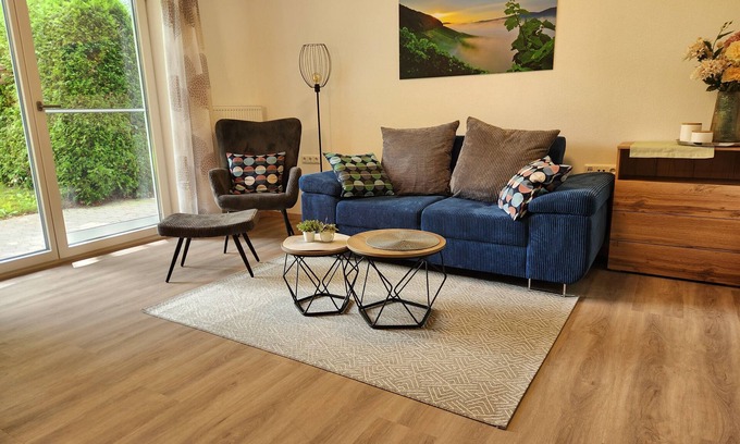 The apartment is set in a very quiet location outside the village, offering a peaceful retreat surrounded by nature. A fallow deer enclosure is located directly at the house, adding to the scenic charm. Shopping facilities and restaurants are 2.5 km away, while nearby swimming spots, cycling routes, and hiking trails provide plenty of outdoor activities.