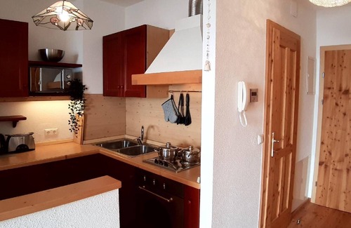 Cozy new Lisa studio, bright and well equipped, 300 m from the Römerbad thermal baths and the Kaiserburg cable car. A double bed, a double sofa bed, kitchen with oven and microwave, bathroom with shower, large balcony with panoramic views, washing machine, ski and bicycle storage, private parking space in the garage.