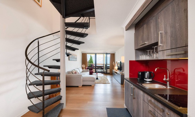 The cozy 2.5 room apartment has 1 bedroom for 2 persons and 1 bathroom with bath/shower combined and a toilet. The apartment has a fully equipped kitchenette (2 hotplates, dishwasher, Nespresso coffee machine, microwave, oven) and a cozy dining and living area with a sofa bed rotatable (day/night) for 2 more people, cable TV/radio. A balcony with a wonderful panoramic view of the surrounding mountains. Free wireless LAN and 1 underground parking space are included in the rental price. Pets are welcome, smoking in the house is not allowed. The apartment is directly connected to a 4-star hotel and the hotel facilities such as indoor pool, bio sauna, Finnish sauna, steam bath and several fitness facilities can be used free of charge.