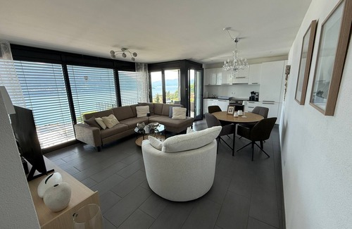 What a location! This spacious apartment for four people is located very close to the Sacro Monte di Brissago, in a quiet street that leads directly to the sanctuary. It is a place of peace and strength in an exposed position above the lake. Ideal for people who are looking for something special. The light-flooded 3.5 room domicile is located on the second floor of an exquisite property with three residential units. From your personal parking space directly at the house, you take the elevator to the top. Then only a few steps separate you and you are there, in your very own private vacation retreat with the lake at your feet. No matter where you are in this elegantly designed apartment in beige and black - whether you are preparing dinner in the open kitchen, enjoying a glass of Ticino wine at the dining table, winding down the evening in the adjoining sofa corner or retiring to one of the two bedrooms - you always have a breathtaking view of the lake and the mountain panorama opposite. Large floor-to-ceiling windows grant you unique views - from every perspective. And what could be better than greeting the day the next morning on the light-flooded terrace in comfortable rattan chairs. The corresponding espresso, cappuccino or latte macchiato is quickly prepared, because the modern, well-equipped kitchen including dishwasher includes a Nespresso coffee machine. Afterwards, it's high time to wake up the late risers. One more trip to one of the two bathrooms with washbasin and shower, and you can start to discover the cultural and scenic attractions of Brissago. By car you can reach the center in less than five minutes. Or you can choose the beautiful walking path that passes directly by the house and takes you to the lake in about 30 minutes. Whether hiking, sports activities, sightseeing or just relaxing - this apartment offers you the best conditions to enjoy your time on Lake Maggiore to the fullest.