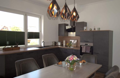 Under the motto “On vacation at home” we warmly welcome you to our new holiday apartment, which you can book now. Arrive and feel good, that is our aim to offer you a relaxing holiday. The holiday apartment has a size of 80 square meters and can accommodate 2 - 4 people + a small child (baby). The living area with a large cozy couch, flat screen TV with satellite connection and direct access to the 20 sqm terrace invite you to feel good. The separate kitchen with dining area has a high-quality kitchen with an induction hob, oven, dishwasher, refrigerator with freezer, toaster, coffee machine, etc. and offers space for cooking, baking and eating. Various spices, filter bags, dishwashing tabs, tea towels, etc. are available. The two bedrooms are each equipped with a large double bed, wardrobe and flat screen TV. A baby travel cot and high chair are available free of charge. The windows are equipped with blackout blinds. The bathroom is modernly furnished with a large shower, towel warmer, sink and washing machine (which you can use free of charge) as well as a separate guest toilet. Garden use is possible. Play equipment available. Smoking is only permitted on the terrace!