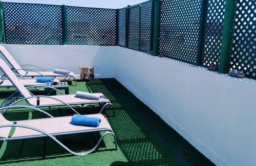 You will have, without going out to the street, an intimate solarium in which the tan is assured, with artificial grass, forget about shoes, also comfortable loungers and for the heat, a refreshing shower.