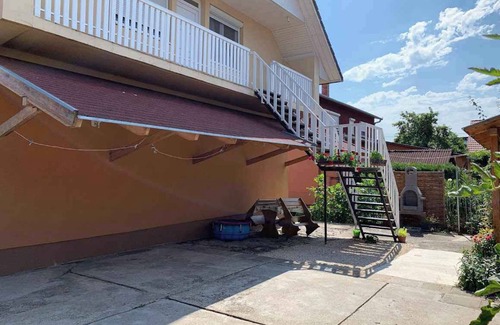 The holiday apartment is located in a single-family home, was renovated in 2021 and is furnished in a functional style. The property is located in the town centre. Also due to its quiet and sunny location the domicile is popular. This property is a family-friendly accomodation. Available for shared use: parasol, sun lounger, children's playground, swing, sandpit, barbecue facilities, terrace, garden furniture and courtyard.LocationBalatonlelle. The holiday apartement is located on a enclosed garden plot with flowers and trees, bordered by a fence. The landlord lives permanently in the house, but uses a seperate entrance. Access is directly from the main road (asphalted). Parking (for 4 cars) is available in a carport and on the property and on the street in front of the house. Specialair conditioning, electric heating. The air conditioning unit can cool and heat.Facilities: baby cot, high chair, internet access (WLAN), safe, iron, ironing board and dryer. TV reception takes place via electric wire. Dogsallowed, EUR 5.00/pet per day. DistancesShopping 800 m, restaurant 500 m, town center 800 m. For a relaxing holiday, a car is not necessary. Balatonlelle: doctor 1200 m, cinema 1300 m, indoor swimming pool, sauna each 2,2 km. railway station, pharmacy, bank each 700 m. thermal bath in Csisztapuszta 26 km. Railway line 60 m. Children's playground 1100 m. Main street at 20 m. In summer: Lake Balaton 250 m in Balatonlelle (beach 500 m in Balatonlelle featuring meadow and sand). Balatonlelle: tennis 2 km and fishing, water sports, boat rental, boat launch each 500 m. dog beach in Fonyód 12 km. horse riding in Rádpuszta 2 km. Restaurants 500m Bicycle hire 1200m SPAR 700m Lidl 2200m DivisionHoliday apartment, 1 floor, 5 rooms (including 4 bedrooms), 92 sqm, in total 10 beds (including 2 additional beds), on request additionally 1 child up to 2 years in a baby cot. RoomThe entrance to your holiday apartment leads over an external staircase directly into the hallway with wardrobe. Living room with TV. All windows and external doors are secured with fly screens. 2 bedrooms each with 1 double bed, 1 additional bed and TV. All windows and external doors are secured with fly screens. 2 bedrooms each with 1 double bed and TV. All windows and external doors are secured with fly screens. Kitchen with electric stove (2 plates), extractor hood, fridge (icebox), microwave, coffee machine and toaster. Hallway. Bathroom with shower, 1 washbasin, WC, hairdryer and window. Bathroom with bathtub, 1 washbasin, WC, hairdryer and window. Separate toilet with WC and window. Terms of lease and pricesIncluded in the priceinternet access, air conditioning, parking place, electricity, water, final cleaning, bed linen, high chair - please order at booking, Wireless Internet access, baby cot (please order at booking). Side costs-Costs on the spot:/Obligatory:local tax by local tariff.Deposit:EUR 50,-/object.