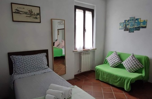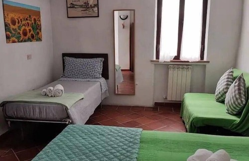 The Apartment Girasole is structured on two levels: on the ground floor there is an equipped kitchen, a bathroom with shower and two entrances to the outside; a spiral staircase leads to the upper floor where we have the second bathroom with shower and a view of the hills. There are also personal hygiene products (shampoo and shower gel). On the right we access the sleeping area which comprises in one space a double bed, a single bed and a sofa bed for one person. The flat is furnished with arte povera antiques.
