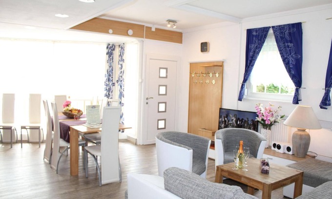 In the living room: HD TV (107 cm), digital TV with many German and international channels (2 satellites: Astra and Hotbird), digital radio, DVD player, radio, CD player (can also be used with USB stick), ceiling fan, games etc. Wardrobe. Wardrobe. In the basement there are 2 bathrooms, 1 x bath and separate shower, washing facilities, WC and 1 x shower, washing facilities. Both bathrooms have a large illuminated LED mirror with time and date display and a large full-length mirror and a hotel hairdryer, 2 modern countertop washbasins with LED-lit fittings. In addition, a music system with CD/radio and USB connection is installed in each bathroom. The equipment of the holiday flat includes: Microwave, coffee machine, toaster and kettle. Pots and pans as well as cutlery and crockery for the maximum possible number of people are of course available. A cot and high chair can be provided free of charge. Outdoor area: In the outdoor area of the Vulkaneifel holiday flat in the City Ferienhaus Vulkaneifel there is an approx. 45 m² terrace with garden furniture. The terrace is surrounded by a fence and hedges on the sunny side of the house and borders the pavement and the busy street to the front. To the side, the terrace borders a small urban park. The holiday flat has 2 parking spaces. These are located in a garage and in front of the garage on the adjoining neighbouring property and can be used there. Many sights and leisure facilities are just a few minutes' walk away. Shopping, shopping, restaurants, cafes, cinema, wellness or indoor hot water pool etc. are just around the corner. A large supermarket and 3 bakeries (also with Sunday sales) are only about 100 to 150 metres away. The 3 lakes are only 2 to 3 kilometres away. Visit the beautiful spa gardens in Daun. The hiking area Wehrbüsch with connection to the Maaren is only 600 to 700 metres away. A large children's playground is only 100 metres away. Daun: The small, cosy district town of Daun (approx. 7,500 inhabitants) is situated at an altitude of approx. 400 to 500 metres. Daun is considered the centre of the Vulkaneifel. Idyllically situated, the holiday resort of Daun is an excellent starting point for the many excursion destinations. You will find many leisure facilities and sights in Daun and the surrounding area. The 3 Daun lakes (Maaren) are only 2 to 4 kilometres away. You can enjoy swimming, boating, fishing and many other water sports here. The Daun Wildlife and Adventure Park and the associated summer toboggan run are just 2 kilometres away. The world-famous Nürburgring race track is only about 18 km away. One of the most beautiful cycle paths in Germany, the Maare - Mosel cycle path (former railway line to the Mosel), starts and ends in Daun. Bicycles can also be hired cheaply in Daun. In the well-known tourist town of Daun, the volcano museum, the indoor swimming pool, many small shops and good guesthouses invite you to visit. Daun: The small, cosy district town of Daun (approx. 7,500 inhabitants) lies at an altitude of approx. 400 to 500 metres. Daun is considered the centre of the Volcanic Eifel. Idyllically situated, the holiday resort of Daun is an excellent starting point for the many excursion destinations. You will find many leisure facilities and sights in Daun and the surrounding area. The 3 Daun lakes (Maaren) are only 2 to 4 kilometres away. You can enjoy swimming, boating, fishing and many other water sports here. The Daun Wildlife and Adventure Park and the associated summer toboggan run are just 2 kilometres away. The world-famous Nürburgring race track is only about 18 km away. One of the most beautiful cycle paths in Germany, the Maare - Mosel cycle path (former railway line to the Mosel), starts and ends in Daun. Bicycles can also be hired cheaply in Daun. In the well-known tourist town of Daun, the volcano museum, the indoor swimming pool, many small shops and good guesthouses invite you to visit. Leisure activities and excursion destinations The Volcanic Eifel is particularly famous for its many maars (crater lakes). The 3 "Dauner Maare" are located directly in the village (Schalkenmehrener Maar) or approx. 2 to 3 kilometres away (Weinfelder and Gemündener Maar). The maars are known as the "eyes of the Eifel". Some of them are bathing lakes with very good water sports facilities and boat hire (e.g. Schalkenmehrener Maar, Gemündener or Pulvermaar), but they are also very well-known nature conservation and hiking areas. The Moselle is not far away. We recommend a trip to Cochem, Traben-Trarbach, Bernkastel or Trier, the oldest city in Germany. The neighbouring countries of Luxembourg, Belgium and France are also well worth a visit. The world-famous Nürburgring with its wide range of events and leisure facilities is very popular with visitors. Or visit one of the countless castles and palaces in the region. Other excursion destinations: Various animal parks, observatory, bell foundry, beekeeping, volcano museum in Daun, Maar museum in Manderscheid, volcano house and volcano adventure trail in Strohn, geo-route, geological excursions, adventure park, visit to the Eifel Nature Park, etc. The Eifel is also very well known for its artists and writers. The successful Eifel crime novels are particularly popular. The Eifel crime thriller festival "Tatort Eifel" attracts many visitors to Daun and the region time and again. Cyclists get their money's worth in the Vulkaneifel. A former railway line has been converted into one of the most popular cycle paths in Germany: The Maare-Mosel cycle path leads from Daun to the Moselle. The return journey can also be made by bus (with bike trailer). The Kosmos cycle path from Daun to Meerfeld is new and also very popular. There are also some of the most beautiful mountain bike trails in Germany in the Volcanic Eifel. The Volcanic Eifel is a true hiking paradise. Two well-known hiking trails are the Lieserpfad and the Eifelsteig. Further tips for your leisure time: Summer