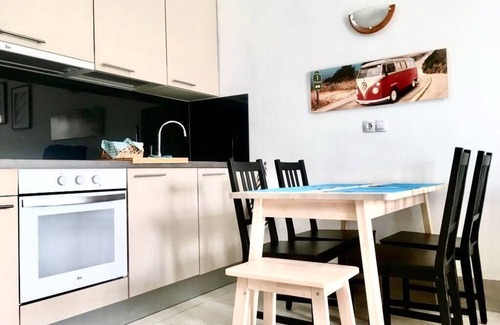 From the airport 35-40 km by single (45) - shared transfer (12), taxi (50) or hire car (from 20 per day). Everything you need is within walking distance and easy to reach. Great restaurants and bars all within walking distance and of course the town centre and old and new harbour. Surf spots and calm waters for children, all close by or right on the doorstep. We are right on the beach and the sea.