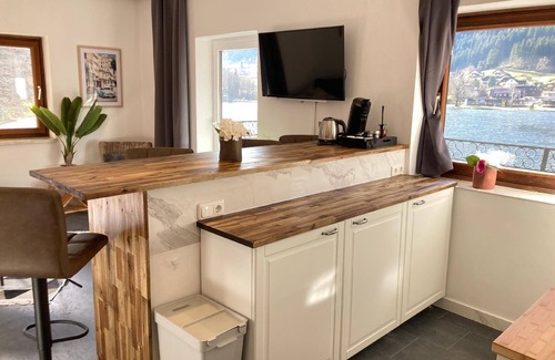 The apartment is located in the historic building Seebrauer. The apartments have been completely renovated and are equipped with all modern comforts. The natural stone floor, the hotel box-spring beds, the sleek elements with wood accents give your holiday a warm home. WiFi everywhere, television with streaming option, kitchen with induction hobs, extractor hood and dishwasher, stunning views of the lake, modern bathroom and the cozy sitting area ensure a relaxing stay.