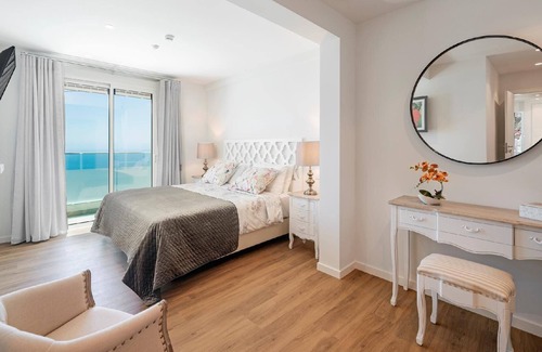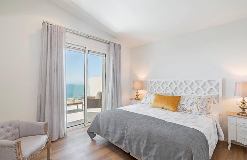 Bedroom 1, 2nd floor, master bedroom, super king-size bed (180cm X 195cm), en-suite, built-in wardrobe, smart tv with connection to internet, air-conditioning, sea-view, French windows to front terrace.