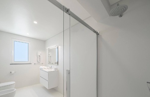 Bathroom 4, 1st floor, single washbasin, walk-in rain shower, toilet, bidet, heated mirror, heated towel rails and wall hairdryer.