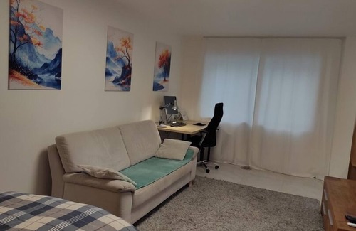 Located in Ötisheim, the holiday apartment "Gästezimmer La Siesta" is a great destination for fitters or business travelers. This cozy 40 m² property occupies an energy-efficient 2022 new build and consists of a living room with a sofa bed for one person, a small but well-equipped kitchen, 1 bedroom, and 1 bathroom with a walk-in shower. Overall, this apartment can accommodate 3 people. On-site amenities include high-speed Wi-Fi (suitable for video calls), a ventilation/air conditioning system, a dedicated workspace for home office, a 40-inch HD TV, a fully automatic coffee machine, and a minibar.