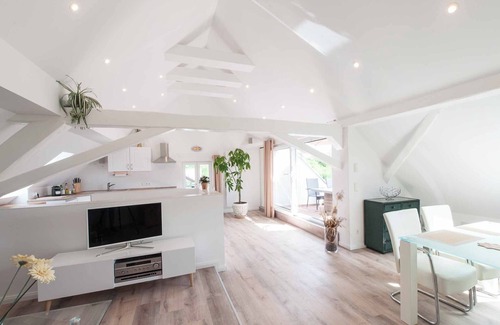 In a quiet and yet central location in Radolfzell on Lake Constance, only 100 m from the lake shore, the light-flooded holiday apartment "Haus Behr am See" enchants guests with its modern and high-quality design. The 120 m² apartment extends over 2 floors: The 3 separately accessible bedrooms with TV are, like the bathroom, on the first floor. The top floor above enchants you with a loggia with lake view and an open kitchen, dining and living area. The apartment can therefore accommodate 6 people and its amenities include Wi-Fi, fans and satellite-TV. On the two furnished balconies you can start the day with a delicious breakfast or round off mild summer evenings with a glass of wine. The lakeside promenade to the harbour and the historic old town are only a 2-minute walk away. A variety of restaurants, cafés, bars and shops await you there. Many popular excursion destinations such as Constance, the island Reichenau, the island Mainau, Stein am Rhein or Meersburg are within a radius of 10 to 20 km.