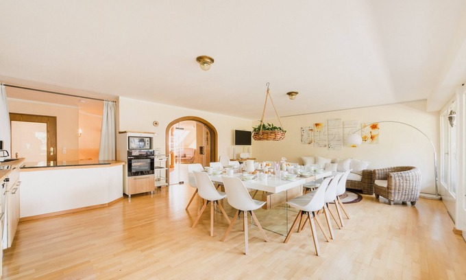The HerzogChalet is a stylish 240 m² holiday apartment for up to 14 guests. A 40 m² living kitchen with a dining table, four bedrooms with double beds, three sofa beds, and a private sauna provide maximum comfort. Two balconies and a garden with a barbecue invite relaxation. Two bathrooms and a guest WC offer additional convenience. Free parking and a garage for bicycles and skis are available. Dogs are welcome (cleaning fee applies).