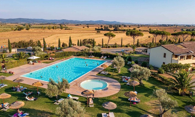 3 stars, lobby, reception (24 hour service), pool bar, common room with board games and children's toys, internet (WLAN) and laundry. ++ Important: WLAN only available outdoors ++ LocationSuvereto. The holiday apartement is located in a residence, on a enclosed plot with meadow, flowers and shrubs. The residence is located at the foot of a hill overlooking the plain of Cornia. The apartment is on the first floor. Access is directly from the main road (asphalted). Parking is available on the property. Specialair conditioning.Facilities: baby cot, high chair, internet access (WLAN) and safe. TV reception takes place via antenna, satellite.For your safety, the accommodation is equipped with smoke detector and fire extinguisher. PoolAll pools are available for shared use. Outdoor pool (usable from mid May to end of September, 12 m x 25 m, depth 1.40 m). Children's pool (diameter 4 m, depth 0.5 m) and paddling pool. LeisureIn the complex: tennis, table tennis and table football. Animation for children from 4 years. Adult animation. Dogsallowed, EUR 10.00/pet per day. DistancesShopping 3 km, restaurant 1000 m, town center 3 km. thermal bath in Calidario Terme Etrusche 7 km. railway station in Campiglia Marittima 7 km. Pisa Airport 100 km In summer: Bathing possibility (beach 13 km in Gulf of Baratti featuring sand). dog beach in Dog Beach 14 km. DivisionHoliday apartment, 1 floor, 2 rooms (including 1 bedroom), 45 sqm, in total 4 beds (including 2 additional beds). PomieszczeniaThe entrance to your holiday apartment is located on the 1st floor