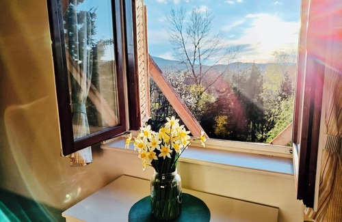 The apartment is located in Badacsonyörs, in a quiet place, at the end of a dead-end street with little traffic. Ideal for a group of friends or a larger family. This upper apartment of the house consists of two floors. On the ground floor there is a large living-dining room with an American kitchen and a couch (a single bed)+ a bedroom for 2 people and a bathroom with a new big bathtub suitable for 2 people. In the attic there are 2 bedrooms, one with two single beds, one with a double bed and a sponge couch which -when opened-is suitable for two kids or younger adults (basically then you have two thick foam mattresses on the ground) Alltogether there is place for minimum 6 adults ( 2 beds in all three bedrooms) + 3 extrabeds: double sponge bed in the attic bedroom and a simple bed, used as a couch in the living room can also be used as an extra bed, alltogether 9 people can sleep in the apartment. The house has a landscaped garden ( shared with guests from the garden apartment, your garden area is marked on the photo) surrounded by large pine trees, the neighborhood is quiet and spacious, characterized by vineyards and fruit orchards, yet accessible via a concrete road. You can also rent the “Garden Apartment” on the ground floor of the house, this is suitable for 4 people. The Balaton coast is 2 km away, child-friendly beaches nearby, best wine bars walking distance.