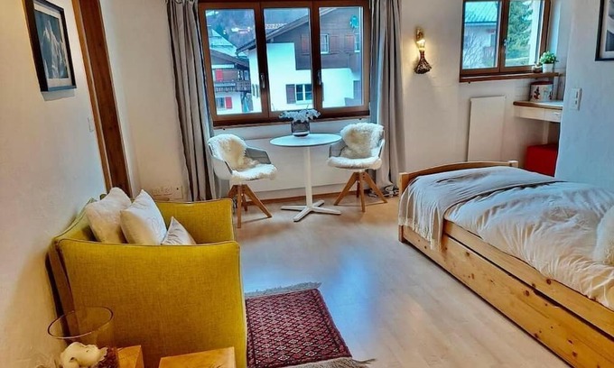 Looking for a bright, charming alpine-style studio in Klosters? Where to park your car and start enjoying the nature right away? The studio is very centrally located, about a thirteen-minute walk from both train stations (Platz and Dorf), while the nearest bus stop is three walking minutes away.