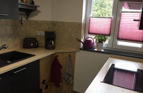 The holiday flat is at ground level, only 2 steps in front of the front door have to be mastered. You then enter a shared vestibule (used by the landlord and tenant) before entering the holiday flat with a separate lockable entrance. This means that you have the flat on the ground floor all to yourself. As landlords, we live on the upper floor. Sometimes you may be greeted by our cat or our little dog, and in our holiday flat you will find a kitchen, a living room with dining table, a bedroom and a bathroom with bathtub. In the bedroom there is also enough space for a baby travel cot.windows and doors should always be closed when leaving the flat.a large double bed in the bedroom for 2 adults and a sofa bed in the living room, this has a lying surface of bed size (width): 130 cm Bed size (length): 191 cm.Possibly too narrow for 2 adults but ideal for 2 children or one adult. A high chair and seat attachment (toddler) for the toilet available.