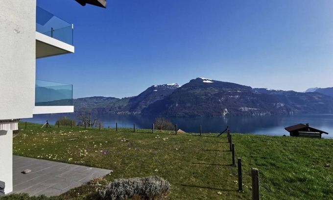 - Idyllic location with a unique view of the beautiful mountains of the Bernese Oberland, and over the whole of Lake Thun from Interlaken to Thun. The apartment is located on the edge of the village in nature, surrounded by a few houses.There are numerous excursion options for summer and winter sports throughout the year in the Bernese Oberland.There is a balcony on the north side and a seat on the south side. The apartment has 2 bedrooms, bathroom, fully equipped kitchen with dishwasher, large living room as well as TV and WiFi.
