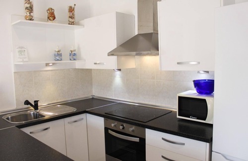 The flat has a living and dining room with integrated kitchen, a hallway with wardrobe and mirror, a spacious shower room and a separate bedroom with large built-in wardrobe and double bed (180x200), window with fly screen, the bright living room has a large floor-to-ceiling sliding door to the huge terrace, a cosy sofa with the possibility for a third person to sleep (140x200). There is a SAT-TV and a stereo system, dining table with 4 chairs. The new fitted kitchen is fully equipped with cooking utensils and crockery. Oven, ceramic hob, extractor bonnet, fridge with freezer compartment, toaster, coffee machine, kettle. In the bathroom there is a shower, washbasin and WC as well as a cupboard for storing personal items and a hairdryer. The terrace has 2 sun loungers and a table with 3 chairs, there is a barbecue for all 3 terraces for shared use and a washing machine in a separate room, fast home office wifi is available free of charge.