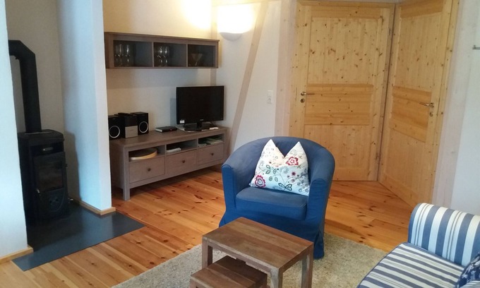 The accessible ground floor apartment 'Lauter' offers around 50 sqm of space for up to 4 people. Wooden floors, half-timbered walls, and a small wood-burning stove create a cozy atmosphere and a pleasant living environment. The apartment has two separate bedrooms, a large bathroom with natural light, and a comfortable living-dining area with a well-equipped kitchenette. On the small south-facing balcony, you can enjoy the wonderful view of the greenery and relax. A parking space at the house is available. The beds are made upon your arrival.