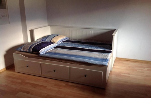 The 60 m² holiday flat is ideal for 4-5 people and has a daybed sofa in the living area, which can be converted into a large, comfortable double bed in a few simple steps. As the ceiling is very high, a floor with a bedroom with 2 single beds has been created. A third bed can be added on request. The large, open-plan living area with kitchenette has a dining table with 5 chairs, satellite TV and free WiFi. The bathroom with window has a shower, toilet and washbasin.