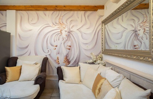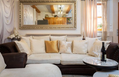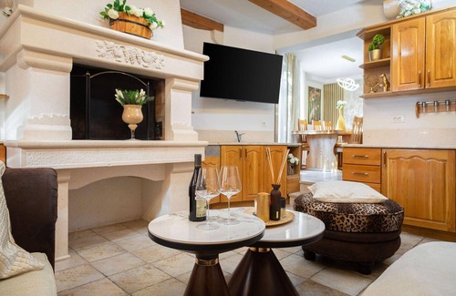 Inside, Apartment Sidus features two well-appointed bedrooms, each designed to ensure a restful night’s sleep. Both rooms come equipped with comfortable double beds, additional bedding options, air conditioning, and ample wardrobe space to store your belongings. The living space is adorned with handmade furniture, reflecting a sense of warmth and homeliness. Air conditioning ensures your comfort year-round, while entertainment is provided by a sleek TV. For your convenience, the apartment is equipped with a full suite of kitchen appliances including a dishwasher, oven, freezer, stove, refrigerator, and a filter coffee machine, alongside complete kitchen utensils, making meal preparation a breeze.