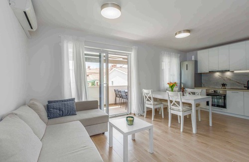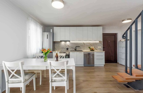 The holiday apartment is located in a terraced house, was renovated in 2022 and is furnished in a modern style. The property is located in the town centre. Also due to its sunny location the domicile is popular. This property is a family-friendly accomodation.LocationPoreč, district Porec Jug. The landlord does not live in the house or on the property. Access is via a side road (asphalted). Parking (for 3 cars) is available on the street in front of the house. Specialair conditioning.Facilities: internet access (WLAN) and washing machine. TV reception takes place via satellite.For your safety, the accommodation is equipped with first aid kid. Dogsnot allowed. DistancesShopping 600 m, restaurant 600 m, town center 850 m. The nearest public transport stop is 800 m away. sauna in 800 m. doctor in Hotel Diamant 600 m. pharmacy in Porec 850 m. airport in Pula 55 km. Children's playground 100 m. In summer: Adriatic Sea 600 m (beach 600 m in Brulo Strand featuring gravel, rocks and bathing plateaus). horse riding in 3,5 km. diving, water sports, boat rental, boat launch each 700 m. dog beach, mini golf each 800 m. tennis in Sport Diamond 500 m. DivisionHoliday apartment, 2 floors, 3 rooms (including 2 bedrooms), 75 sqm, in total 4 beds. RoomThe entrance to your holiday apartment is located on the 1st floor