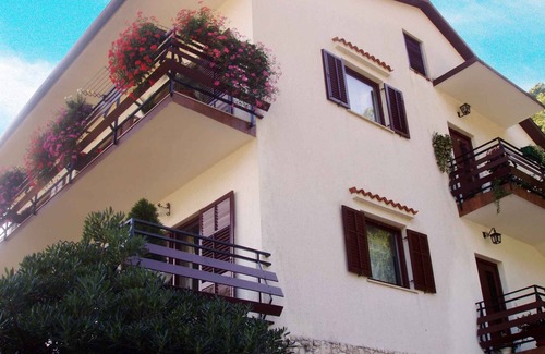 The holiday apartment is located in an apartment house and is furnished in a functional style. The property is located on the outskirts. Also due to the view over a panorama from the property and its quiet and sunny hillside location the domicile is popular. Available for shared use: parasol, barbecue facilities, garden furniture and courtyard.LocationMošćenička Draga. The holiday apartement is located on a 680 sqm enclosed garden plot with flowers, shrubs and trees. The landlord lives permanently in the house, but uses a seperate entrance. In the same house Holiday room KVA MOS 007 are (3 persons) and KVA MOS 008 (3 persons) and apartment KVA MOS 006 (8 persons). Access is via a side road (asphalted). Parking (for 6 cars) is available on the property. Specialair conditioning. TV reception takes place via satellite. Dogsallowed, EUR 6.00/pet per day. DistancesShopping 500 m, restaurant 400 m, town center 800 m. doctor, pharmacy, bank each 800 m. sauna in Moscenicka Draga in Hotel Marina 800 m. In summer: Adriatic Sea 800 m (beach featuring gravel, stones and bathing plateaus). tennis, diving, boat launch each 800 m. DivisionHoliday apartment, 1 floor, 2 rooms (including 1 bedroom), 40 sqm, in total 4 beds (including 1 cot). RoomThe entrance to your holiday apartment is located on the ground floor, is at ground level and leads directly into the kitchen-diner. Living room (walk-through room) with 1 additional bed on couch/sofa (only suitable for children), TV, dining area, access to the terrace (8 sqm, covered, garden furniture) and sea view. Bedroom with 1 double bed and 1 single bed. Cooking nook in the living room with gas stove (2 flames), electric stove (2 plates), oven, extractor hood, fridge (icebox) and coffee machine. Bathroom with shower, 1 washbasin and WC. Terms of lease and pricesIncluded in the priceair conditioning, parking place, electricity, gas, water, final cleaning, bed linen. Side costs-Additionally(Payable when booking)/local tax.Costs on the spot:/On request:washing machine 7 € per stage of washing programme based on usage.Deposit:EUR 100,-/object