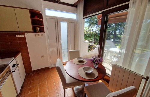 The holiday apartment is located in an apartment house and is furnished in a functional style. The property is located in a residential area, in the town centre. Available for use: barbecue facilities, terrace and garden furniture.LocationLabin. The holiday apartement is located on a garden plot. The landlord lives permanently in the house, but uses a seperate entrance. Access is via a side road. Parking (for 1 car) is available on the property. Specialair conditioning.Facilities: internet access (WLAN) and iron. TV reception takes place via satellite. Dogsnot allowed. DistancesShopping 800 m, restaurant 800 m, town center 800 m. airport in Pula 50 km. In summer: Adriaitic sea 6 km in Rabac (beach 6 km in rabac featuring gravel, stones and rocks). DivisionHoliday apartment, 1 floor, 2 rooms (including 1 bedroom), 30 sqm, in total 3 beds. RoomThe entrance to your holiday apartment is located on the mezzanine floor. Bedroom (10 sqm) with 1 double bed, 1 single bed and TV. Eat-in kitchen (5 sqm) with dining area (3 seats) and access to the terrace (15 sqm, garden furniture). Cooking nook in the kitchen-diner with gas stove, fridge (icebox), coffee machine and electric kettle. Bathroom (3 sqm) with shower, 1 washbasin, WC and hairdryer. Terms of lease and pricesIncluded in the priceelectricity, water, final cleaning, bed linen, hand towels. Deposit:No deposit.