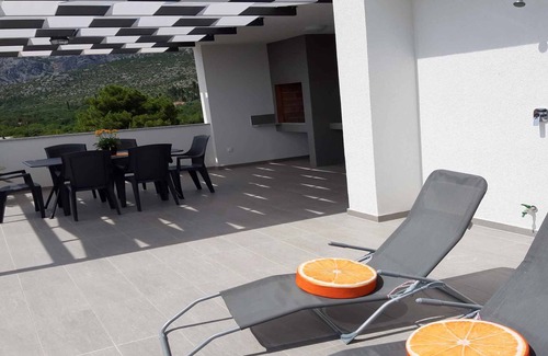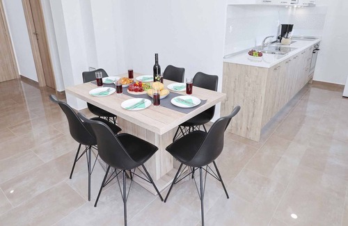 The holiday apartment is located in an apartment house and is furnished in a modern style. The property is located in a residential area. Also due to the view over the sea from the property and its quiet and sunny location the domicile is popular. Available for use: barbecue facilities, terrace and garden furniture.LocationSeline. The landlord lives only occasionally in the house. Access is via a side road (asphalted, length 200 m). Parking is available on the property. Specialair conditioning.Facilities: internet access (WLAN). TV reception takes place via satellite. PoolAll pools are available for shared use. Outdoor pool (usable from early May to early October, 8 m x 4 m, depth 1,5 m). The pool is 32 m² Dogsnot allowed. DistancesShopping 700 m, restaurant 550 m, town center 600 m. Seline: doctor 600 m and discotheque 840 m. pharmacy in Starigrad 3 km. Main road 85 m. Children's playground 400 m. In summer: Adriatic Sea 400 m in Seline (beach 400 m in Seline featuring gravel and bathing plateaus). dog beach in Seline 1500 m. water sports, boat rental each 4 km in Starigrad. DivisionHoliday apartment, 1 floor, 3 rooms (including 2 bedrooms), 75 sqm, in total 6 beds (including 2 additional beds), on request additionally 1 child up to 2 years in a baby cot. RoomThe entrance to your holiday apartment leads directly into the kitchen-diner. Bedroom (12 sqm) with 1 double bed. Bedroom (12 sqm) with 1 double bed and 1 baby cot. Eat-in kitchen (30 sqm) with 2 additional beds on couch/sofa, sitting area, TV, dining area and access to the balcony. Kitchenette in the kitchen-diner (6 sqm) with electric stove (ceramic hob), oven, extractor hood, dishwasher, fridge (icebox), microwave and electric kettle. Bathroom (5 sqm) with shower, 1 washbasin and WC. Terms of lease and pricesIncluded in the priceinternet access, baby cot, high chair, air conditioning, parking place, laundry dryer, electricity, gas, water, final cleaning, bed linen, hand towels, pool, sunloungers at the pool, barbecue, Wireless Internet access. Side costs-Additionally(Payable when booking)/local tax.Deposit:No deposit.