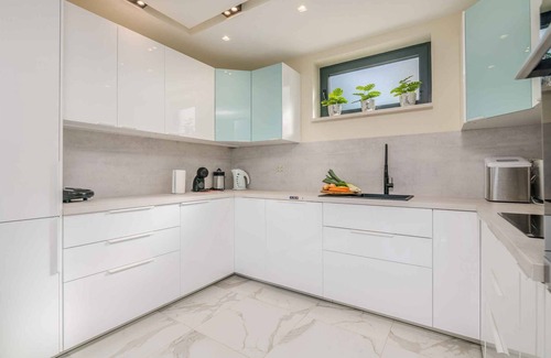 The holiday apartment is located in an apartment house built in 2018, was renovated in 2021 and is furnished in a modern and luxury style. Also due to the view over the sea from the property and its quiet hillside location the domicile is popular. Available for your exclusive use: sunbathing lawn, parasol, sun lounger, garden shower, barbecue facilities, terrace and garden furniture.LocationMasons. The holiday apartement is located on a 1000 sqm enclosed garden plot with flowers, shrubs and trees, bordered by a fence. The landlord lives only occasionally in the house, but uses a seperate entrance. Access is via a side road (asphalted). Parking is available on the property. Specialair conditioning, underfloor heating.Facilities: baby cot, high chair, internet access (WLAN), safe, iron and washing machine. TV reception takes place via satellite. PoolAll pools are available for exclusive use. Outdoor pool (3 m x 7 m, depth 1,4 m). Dogsnot allowed. DistancesShopping 580 m (2 km in winter), restaurant 260 m, town center 2,2 km. indoor swimming pool, sauna each 1,6 km in Hotel Malin. Malinska: doctor 2 km and pharmacy, bank each 2,2 km. airport in Omisalj 24 km. railway station in River 40 km. Main road 50 m. Children's playground 300 m. In summer: Blue Waves Resort 300 m in Malinska (beach 300 m in Blue Waves Resort featuring gravel). diving in Hotel Malin 1,6 km. tennis, horse riding each 8 km in Njivice. DivisionHoliday apartment, 2 floors, 4 rooms (including 3 bedrooms), 180 sqm, in total 6 beds (including 2 additional beds). RoomThe entrance to your holiday apartment is located on the ground floor and leads over an external staircase directly into the kitchen-diner.Ground floor: Living room (walk-through room) with sitting area, TV, dining area (6 seats) and access to the terrace (garden furniture, 1 table, 2 sunbeds). Kitchen with (induction stove), oven, extractor hood, dishwasher, fridge (icebox), microwave, coffee machine, toaster and electric kettle. Bathroom with washing machine, shower, 1 washbasin, WC, hairdryer and window. 1st floor: Bedroom with 2 bunk beds. Bedroom with 1 double bed. Bedroom with 1 double bed and 1 baby cot. Bathroom with shower, 1 washbasin, WC, hairdryer and window. Terms of lease and pricesIncluded in the pricebabycot, internet access, air conditioning, parking place, electricity, gas, water, final cleaning, bed linen, hand towels, Wireless Internet access. Side costs-Additionally(Payable when booking)/local tax.Costs on the spot:/Obligatory:registration fee 5 € per person per stay.Deposit:EUR 400,-/object.