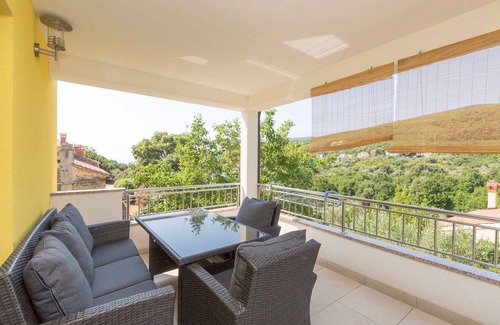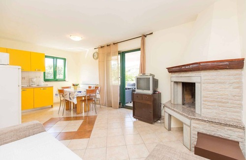 The holiday apartment is located in an apartment house built in 2002 and is furnished in a typical country style. The property is located in the town centre. Also due to the view over a panorama from the property and its quiet and sunny location the domicile is popular. Available for shared use: barbecue facilities.LocationSveta Marina. The holiday apartement is located on a 200 sqm enclosed garden plot with meadow and shrubs. The landlord does not live in the house or on the property. The holiday apartments IST LAB 047 and IST LAB 048 (each for 5 persons) are located in the same house. Access is via a side road (asphalted). Parking is available on the street in front of the house. Specialair conditioning. TV reception takes place via satellite. Dogsnot allowed. DistancesShopping 20 m, restaurant 20 m, town center 8 km. Children's playground 200 m. In summer: Adriatic Sea 120 m in Sveta Marina (beach 120 m in Sveta Marina featuring stones). tennis in Ravni 5 km. diving in Sveta Marina 500 m. DivisionHoliday apartment, 1 floor, 3 rooms (including 2 bedrooms), 55 sqm, in total 5 beds (including 1 additional bed). RoomThe entrance to your holiday apartment is located on the ground floor, is at ground level and leads directly into the hallway with doors to all rooms. Bedroom with 2 single beds. Bedroom with 1 double bed. Living/bedroom with 1 additional bed on couch/sofa, sitting area, TV, fireplace, dining area (6 seats) and access to the balcony (3 sqm, garden furniture, 1 table, 4 chairs). Cooking nook in the living & bedroom with electric stove (2 plates), fridge (icebox), microwave, coffee machine and electric kettle. Bathroom with bathtub with shower facility, 1 washbasin, WC and window. Terms of lease and pricesIncluded in the priceair conditioning, parking place, electricity, gas, water, final cleaning, Bed linen (weekly change). Side costs-Additionally(Payable when booking)/local tax.Deposit:EUR 100,-/object