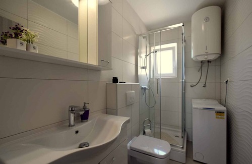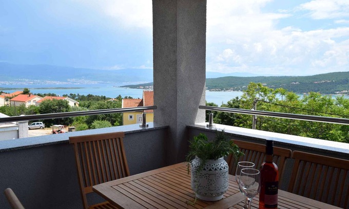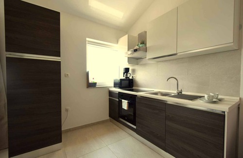 The holiday apartment is located in an apartment house, built in 2022, renovated in 2022 and is modern furnished. The property is located in a busy environment, on the outskirts. For common use are available: parasol, sun lounger and grill possibility.LocationČižići. The holiday apartement is located on a 200 sqm, closed plot, limited by a fence. The landlord does not live in the house or on the property. The access goes via a side road (asphalted). Parking lot (for 1 car) on the property. Specialair conditioner. Facilities: internet access (WLAN) and washing machine. TV reception takes place via satellite. PoolOutdoor pool (6 m x 4 m, depth 1,5 m, for common use). Dogsnot allowed. DistancesShopping opportunity 400 m, restaurant 550 m, town center 500 m. bank in Malinska 10 km. pharmacy in Šilo 7 km.In summer: the Adrian Sea 600 m in Čižići (beach 600 m in Čižići with gravel). DivisionHoliday apartment, 1 floor, 3 rooms (including 2 bed rooms), 65 sqm, in total 5 beds. Room1st floor: Bathroom (5 sqm) with washing machine, shower, 1 sink and WC. 2nd floor: Living room (10 sqm) with 1 single bed and sitting area. Bedroom (12 sqm) with 1 double bed. Bedroom (16 sqm) with 1 double bed. Kitchen in the dining room (10 sqm) with dining area (5 seats), electric stove (4 plates), oven, extractor hood, dishwasher, fridge, microwave, coffee machine, toaster, electric kettle and access to the balcony. Terms of lease and pricesIncluded in the priceinternet access, air conditioning, parking place, electricity, gas, water, final cleaning, bed linen, hand towels, Wireless Internet access. Side costs-Costs on the spot:/Obligatory:registration fee 11 € per person per stay.Deposit:EUR 200,-/object.