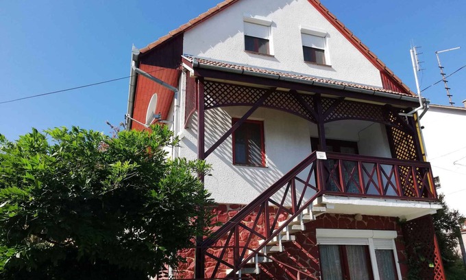 The holiday apartment is located in an apartment house, was renovated in 1998 and is furnished in a functional style. The property is located in the town centre. Also due to its quiet and sunny location the domicile is popular. Available for shared use: parasol, barbecue facilities, garden furniture, Hollywood swing and campfire site.LocationZalakaros. The holiday apartement is located on a 570 sqm enclosed garden plot with meadow, flowers, shrubs and trees, bordered by a fence. The landlord does not live in the house or on the property. Access is via a side road (asphalted). Parking (for 4 cars) is available on the property. Specialoven in every room (gas). Heating.Facilities: internet access (WLAN) and iron. TV reception takes place via satellite. TV programme in DEFor your safety, the accommodation is equipped with smoke detector. Dogsnot allowed. DistancesShopping 200 m, restaurant 100 m, town center 200 m. thermal bath in Zalakaros 300 m. Sármellék Airport 18 km. Bus stop 130 m. In summer: fishing in Újszabar 8 km. DivisionHoliday apartment, 1 floor, 2 rooms (including 1 bedroom), 36 sqm, in total 4 beds (including 2 cots). RoomThe entrance to your holiday apartment is located on the 2nd floor and leads over an external staircase and the terrace directly into the kitchen-diner. Bathroom with shower, 1 washbasin, WC and window. Bedroom with 2 single beds. Living/bedroom with 2 additional beds on double sofa bed (only suitable for children under the year of 12), TV and access to the balcony (4 sqm, covered, garden furniture, 1 table, 4 chairs, parasol). American kitchen with TV, electric stove (2 plates), fridge, microwave, coffee machine, toaster, electric kettle and Wi-Fi. Terms of lease and pricesIncluded in the priceinternet access, parking place, electricity, gas, water, final cleaning, bed linen, Welcome drink, Wireless Internet access. Side costs-Costs on the spot:/Obligatory:local tax by local tariff.On request:heating 2 € per object per day (11.10.25-01.11.25, 01.11.25-18.04.26, 10.10.26-31.10.26), baby cot (please order at booking) 13 € per bed per day.Deposit:EUR 50,-/object.