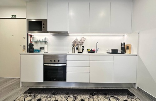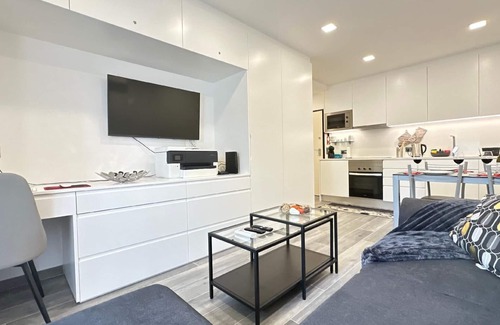 Enjoy a spacious bedroom, fully equipped kitchen, open-plan living room with sofa and flat-screen TV.
