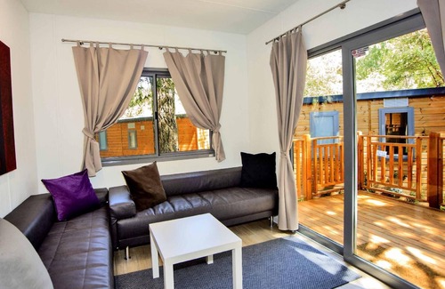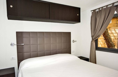 Spacious mobile home with a large bedroom with a double bed, a bedroom with two single beds, a bathroom with a WC, shower, washbasin and bidet, and a spacious living room-kitchen, a sofa bed, TV and air conditioning.