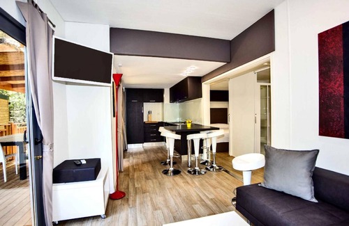 The deluxe mobile home also provides a veranda with a table and chairs.