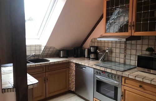Spacious rooms are offered in this flat. Decorated in neutral colours, the split-level flat is comfortably furnished and consists of two bedrooms, an open-plan living and dining area and a large balcony. You can prepare your own meals in the flat's well-equipped kitchen. There is a separate entrance in the house. Baby cot and high chair are available, bed linen and towels included. Breakfast or bread roll service is available on request. The bed dimensions are 180*200 cm per double bed. There is underfloor heating on the ground floor and in the bathroom on the upper floor. The living room and bedroom are equipped with radiators.