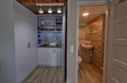 The flat itself is an oasis of peace and cosiness with an area of around 15-17 m². It is cleverly furnished to offer you maximum functionality in the available space. The equipment includes a flat-screen TV, which provides entertainment after a long day of adventure. The air conditioning system ensures a pleasant indoor temperature at all times, regardless of the weather conditions outside. For preparing small meals, you will find a well-equipped kitchenette with a 2-ring hob, a filter coffee machine and a kettle.