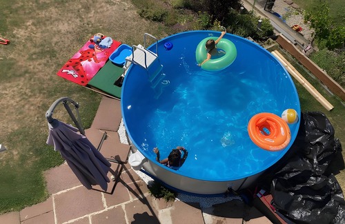 You have access to a shared outdoor area with a pool, garden, table tennis table, and playground. Via a separate entrance, you reach the laundry room with washing machine and dryer (shared with the landlords, use for a fee, detergent included). Next to it is a playroom with game console, children's books, and toys.