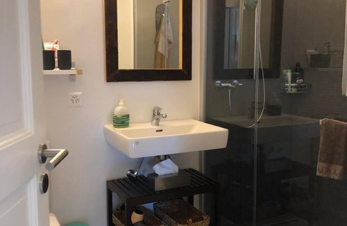 The modern renovated bathroom has a walk-in shower, WC and washbasin. Outside the flat is a spacious terrace from which you can marvel at the unique sea of lights on the opposite shore after dark. The outdoor area is equipped with a dining table and deckchairs.