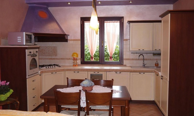 Guests will have the entire flat at their disposal. They can enjoy resting under the veranda and walking in the wooded park in front of the entrance, in the centre of which is an artificial pond with fish and a small waterfall.