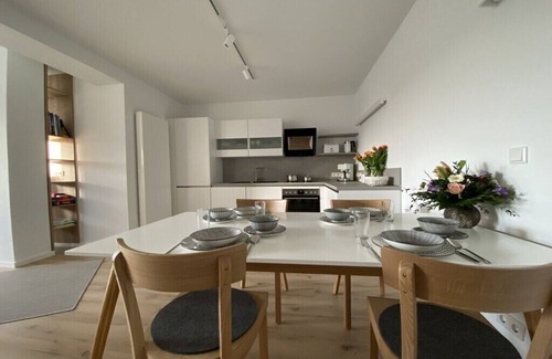 "17 AM BERG" is located in Siedlinghausen, in the beautiful Sauerland region, about 8 km from the town center of Winterberg. Our house is situated on a south-facing slope, with stunning views and plenty of sunshine. "17 AM BERG" is a basement apartment with garden access, is brightly furnished, and has a separate entrance. A public children's playground is just 150 meters away. The apartment was completely renovated and refurbished in April 2021. Everything is state-of-the-art! The bedrooms each have a box-spring bed and wardrobes or shelves, beautiful chandeliers, and a QLED wall-mounted smart TV. The living room features another designer TV, "The Sero." Free Wi-Fi is available in all rooms. The furnishings are high-quality, with a white kitchen equipped with a dishwasher, toaster, kettle, filter coffee, and a Nespresso capsule machine, among other amenities. A parking space with a charging station is available directly next to the apartment. Additional parking spaces are available in the immediate vicinity. There is access to the garden, which features a seating area. A charcoal grill can be provided. The adjacent boiler room, which also serves as a ski storage room, has a washing machine, dryer, vacuum cleaner, and other appliances for guest use.