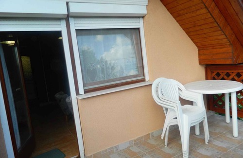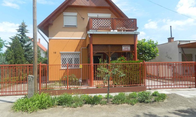The holiday apartment is located in a single-family home and is furnished in a modern style. The property is located in the town centre. Also due to its quiet and sunny location the domicile is popular. Available for use: barbecue facilities, terrace, garden furniture, Hollywood swing and courtyard.LocationCserkeszőlő. The holiday apartement is located on a 200 sqm enclosed garden plot, bordered by a fence. The landlord does not live in the house or on the property. Access is via a side road (asphalted). Parking (for 2 cars) is available on the property. Specialair conditioning, central heating (gas). TV reception takes place via satellite. Stations in different languages. Dogsallowed. Free of charge. DistancesShopping 500 m, restaurant 500 m, town center 500 m. thermal bath in Cserkeszőlő 600 m. In summer: Bad Cserkeszőlő (beach 600 m in Cserkeszőlő). DivisionHoliday apartment, 1 floor, 2 rooms (including 2 bedrooms), 46 sqm, in total 4 beds. RoomThe entrance to your holiday apartment is located on the ground floor. Bedroom with 1 double bed and TV. Bedroom with 2 single beds. Cooking nook in the living room with dining area (4 seats), gas stove (4 flames), oven, fridge (160 l, icebox), microwave, coffee machine and toaster. Bathroom with shower, 1 washbasin, WC and window. Terms of lease and pricesIncluded in the priceparking place, electricity, water, final cleaning, bed linen. Side costs-Costs on the spot:/Obligatory:local tax by local tariff.On request:air conditioning 600 Ft per object per day.Deposit:No deposit.